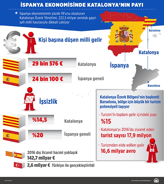 AA muhabirinin derlediği verilere göre, tartışmalı referandumla dünya gündeminde sıkça yer alan Katalonya Özerk Yönetimi, İspanya'nın gayri safi yurtiçi hasılasının yaklaşık yüzde 19'unu üreterek, ülkenin diğer bölgelerine göre daha güçlü bir ekonomik görünüm ortaya koyuyor.