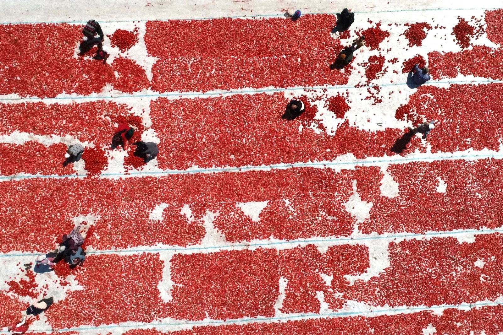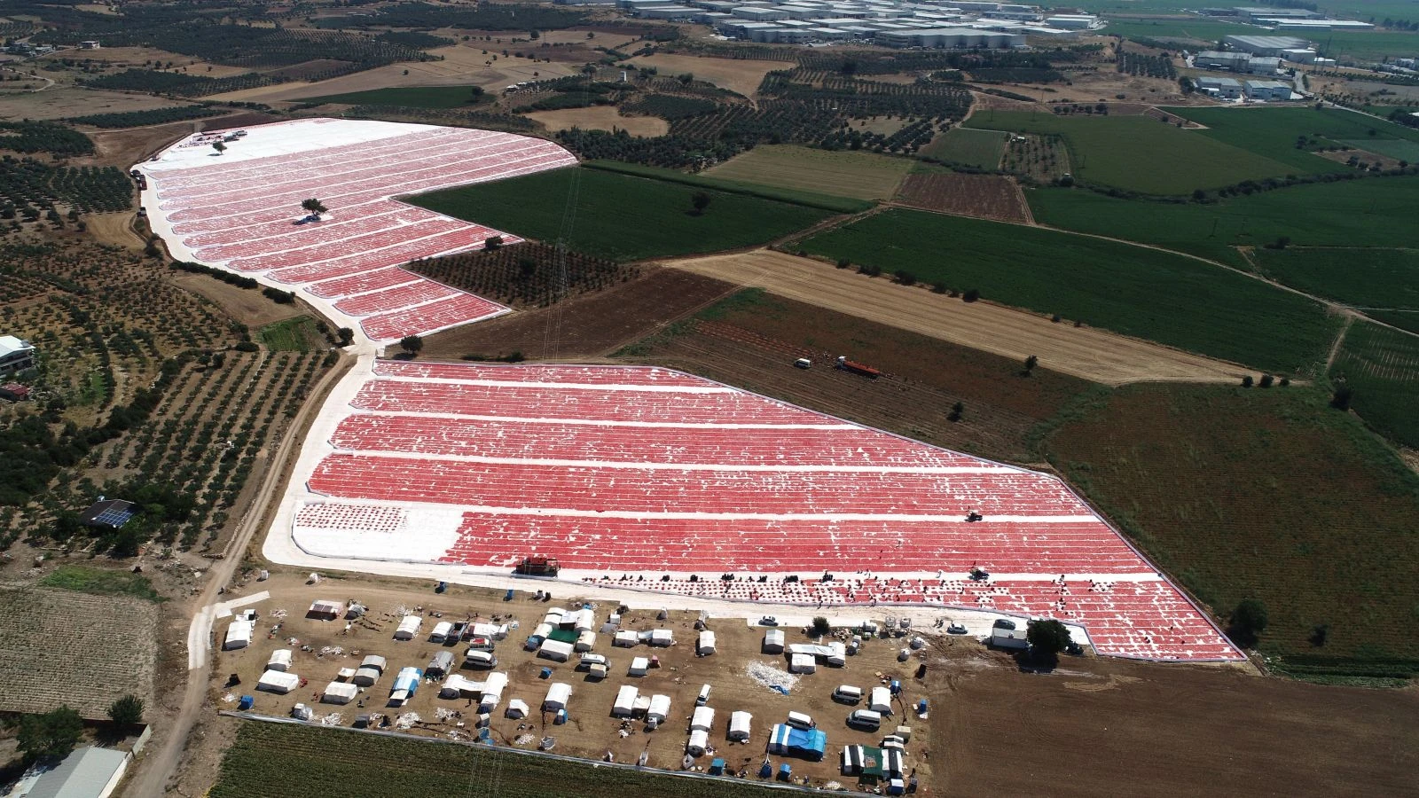 İzmir’in Torbalı Ovasında domates hasadının başlamasının ardından kurutmak için ayrılan domatesler tarlalara serilmeye başlandı. Serilen domatesler, Torbalı Ovasını adeta kırmızıya boyadı.