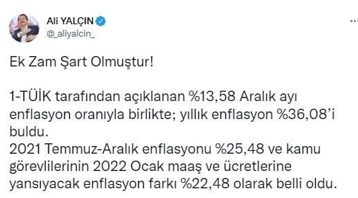 Memur-Sen Genel Başkanı Ali Yalçın yaptığı açıklamada, memur maaşlarına enflasyon farkınının yüzde 22.48 olduğunu belirterek ek zammın şart olduğunu açıkladı. Yıllık enflasyonun yüzde 36,08'e ulaştığının altını çizen Yalçın, sosyal medya hesabından şu paylaşımı yaptı: