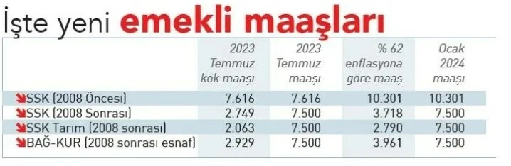 2024 yılı itibariyle asgari ücretliden memura, işçiden emekliye milyonlarca kişinin gelirinde önemli artış bekleniyor. Merkez Bankası'nın yüzde 65 olarak açıkladığı yılsonu enflasyon tahminine göre SSK, Bağ-Kur emeklilerinin aylığı ocak ayında refah payı hariç yüzde 37.76, memurların da yüzde 49.96 artacak. En düşük memur maaşı 33 bin liraya yaklaşırken, en düşük memur emekli aylığı da yaklaşık 15 bin lira olacak. Merkez Bankası tahminin üst noktası yüzde 68 olarak gerçekleşirse Ocak'ta SSK, Bağ-Kur emekli aylıklarına refah payı hariç yüzde 40.28, memur ve emeklilerine yüzde 52.19 zam yapılacak. Refah payıyla birlikte emeklilere yapılan zam da yüzde 52'yi geçecek.