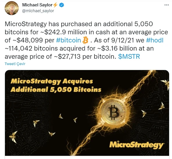 Şirketin CEO'su Twitter hesabından yaptığı açıklamada 242,9 milyon dolar karşılığında 5 bin 50 Bitcoin aldıklarını duyurdu. Böylece şirket elinde tuttuğu Bitcoin miktarı 114 bin 42'ye yükseldi.