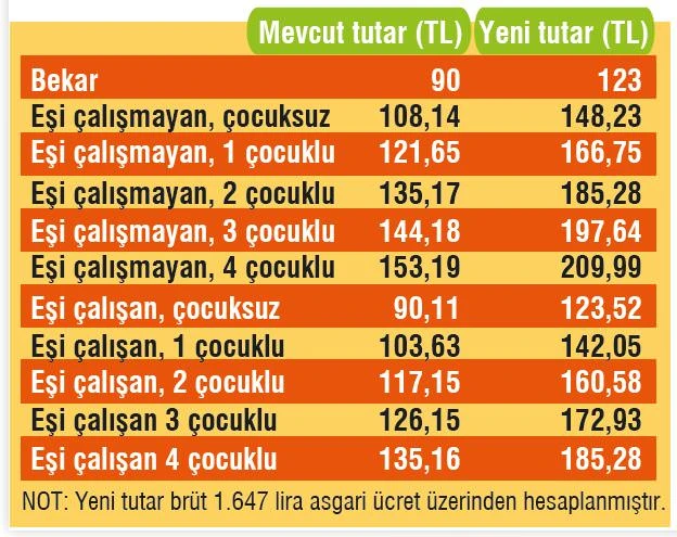 Ocak ayında net bin 300 liraya çıkacak asgari ücretin brütü ise bin 647 lira olacak. Buna göre yapılan hesaplamaya göre; bekar çalışanın asgari geçim indirimi 90 liradan 123 liraya ulaşacak. Asgari geçim indirimi; evli, eşi çalışmayan, çocuksuz kişi için 108 liradan 148 liraya, evli, eşi çalışmayan, 1 çocuklu kişi için 121 liradan 166 liraya, evli, eşi çalışmayan, 2 çocuklu kişi için 135 liradan 185 liraya, evli, eşi çalışmayan 4 çocuklu kişi için ise 153 liradan 210 liraya yükselecek. Evli ve eşi çalışan kişiye de, çocuksuz ise 90 lira yerine 123 lira, 1 çocuklu ise 103 lira yerine 142 lira, 2 çocuklu ise 117 lira yerine 160 lira, 4 çocuklu ise 135 lira yerine 185 lira ödenecek.