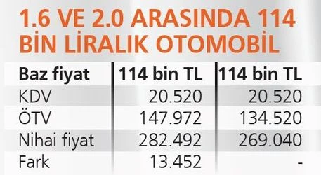 Pahalı araçlarda baz rakamlar düşürülünce vergideki artış da arttı. Motor silindir hacmi 1.600 ile 2 bin cc arasında ve vergisiz fiyatı 114 bin lira olan aracın vergisi bugünden itibaren 13 bin 452 lira azaldı. Satış fiyatı da 282 bin 492 liradan 269 bin 40 liraya geriledi.