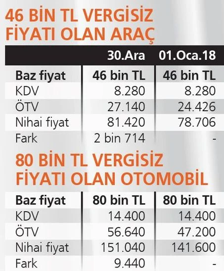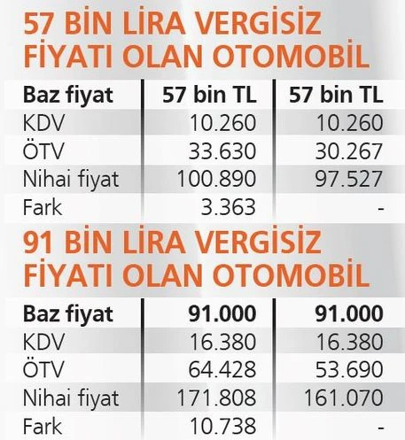 Bu düzenlemeyle kurdaki yükseliş sonucu baz fiyatı yükseldiği için vergi dilimi artan ve bir üst dilimden vergilenen birçok aracın satış fiyatı düştü. 30 Aralık’ta vergisiz fiyatı 46 bin lira olan araçlardan yüzde 50 ÖTV alınırken bu oran bugün yüzde 45’e inmiş olacak. Böylece bu aracı satın alanlar 2 bin 714 lira daha az vergi ödeyerek araç sahibi olacak.