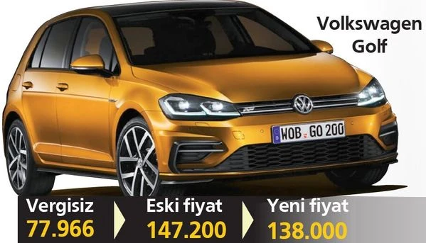 Örnek olarak vergisiz fiyatı 77 bin 966 lira olan Volkswagen Golf 1.4 TSI’nin satış fiyatı böylece 147 bin 200 liradan 138 bin lira düzeyine gerileyecek.