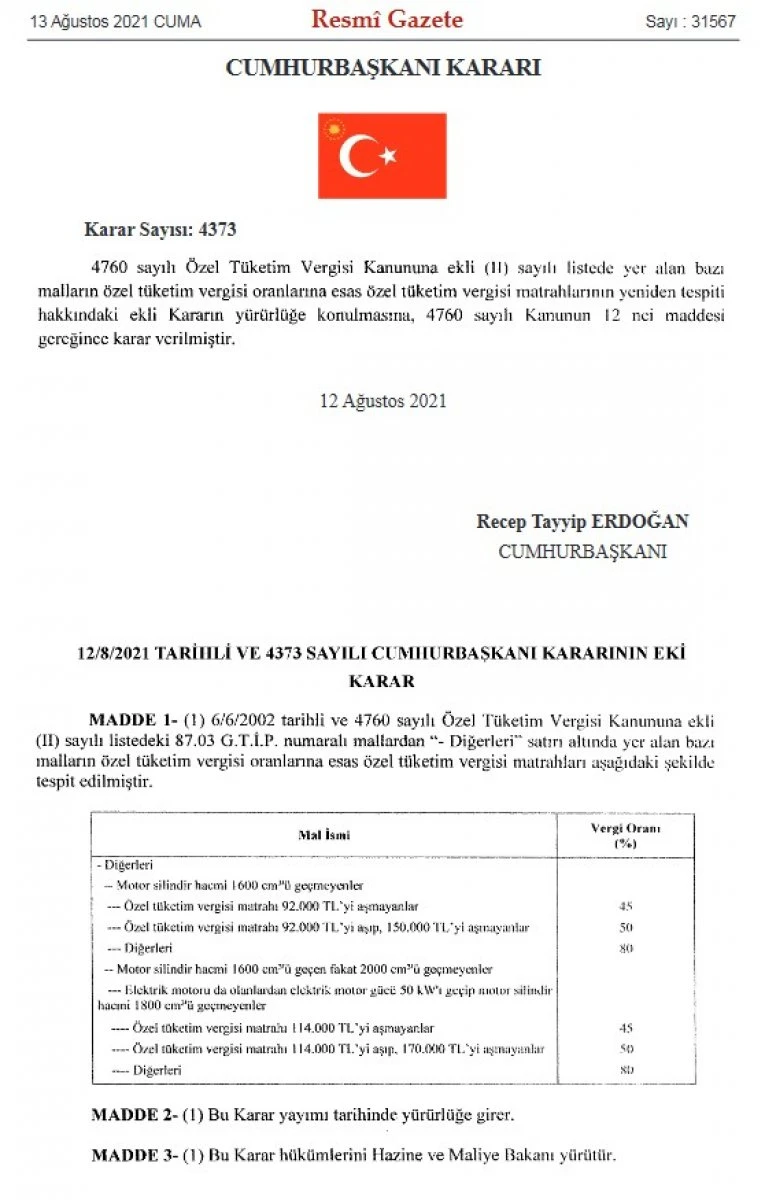 Özel Tüketim Vergisi matrah oranlarında yeni bir düzenleme yapıldı. ÖTV matrah oranı artırıldı. Bu kapsamda, Resmi Gazete’de yayımlanan karar ile 1600 cm3 silindir hacmine kadar yüzde 45 ÖTV dilimindeki matrah limiti 85 bin liradan 92 bin liraya yükseltildi.