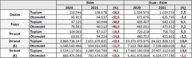 2021 yılı Ocak-Ekim döneminde bir önceki yılın aynı dönemine göre, toplam otomotiv ihracatı dolar bazında yüzde 19, euro bazında geçen yılın aynı dönemine göre yüzde 14 arttı. Bu dönemde toplam otomotiv ihracatı 24,3 milyar dolar olarak gerçekleşirken, otomobil ihracatı yüzde 3 artarak 7,5 milyar dolar seviyesinde gerçekleşti. Euro bazında otomobil ihracatı ise yüzde 2 azalarak 6,3 milyar euro seviyesinde gerçekleşti.
