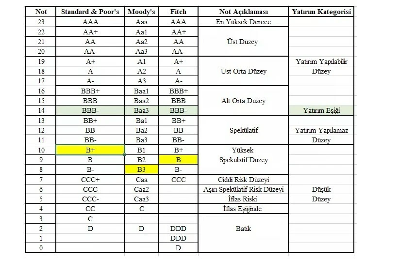 Buna göre; S&P’nin B+ notu ‘Yüksek Spekülatif Düzey’ anlamına gelirken, yatırım kategorisi olarak ise 'Düşük Düzey’de yer aldı. S&P’nin notu Yatırım Eşiği’nin hemen altında yer aldı.