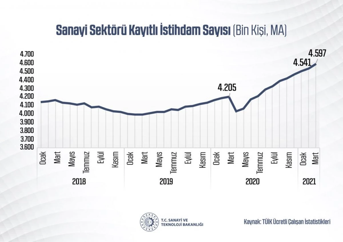 Martta sanayi sektöründeki kayıtlı istihdam bir önceki aya göre 56 bin, geçen yılın aynı ayına göre 392 bin artarak 4 milyon 597 bin oldu."