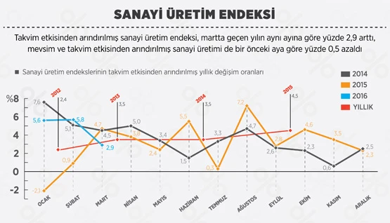 Takvim etkisinden arındırılmış sanayi üretim endeksi, martta geçen yılın aynı ayına göre yüzde 2,9 arttı, mevsim ve takvim etkisinden arındırılmış sanayi üretimi de bir önceki aya göre yüzde 0,5 azaldı. Türkiye İstatistik Kurumu (TÜİK), mart ayına ilişkin sanayi üretim endeksi sonuçlarını açıkladı. Buna göre, mevsim ve takvim etkisinden arındırılmış sanayi üretimi, martta bir önceki aya göre yüzde 0,5 azaldı. Takvim etkisinden arındırılmış sanayi üretimi ise geçen yılın aynı ayına göre yüzde 2,9 arttı. Öte yandan, arındırılmamış sanayi üretim endeksinde, martta geçen yılın aynı ayına göre yüzde 4,7 artış kaydedildi.