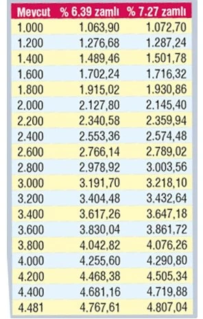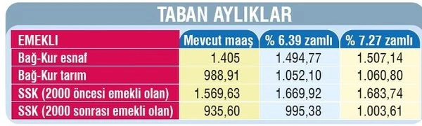 Bu, tahmin gerçekleşirse ilk 6 aylık enflasyon yani SSK ve Bağ-Kur emeklilerinin zam oranı yüzde 7.27 olacak. Memur emeklilerine de yüzde 3.5'lik toplu sözleşme artışına ilaveten yüzde 3.27 enflasyon farkı oluşacak. Halen en düşük memur emeklisi aylığı bin 978 lira seviyesinde bulunuyor. Yüzde 6.77'lik artış bu maaşı 2 bin 111 lira 95 kuruşa yükseltecek. Bağ-Kur esnaf emeklilerinde ise taban maaş bin 405 lira seviyesinde bulunuyor. Bu maaş zam oranı yüzde 7.27 olursa, bin 507 lira 14 kuruşa çıkacak. Yüzde 7.27'lik artış Bağ-Kur tarım emeklililerinde de halen 988,91 lira olan en düşük maaşı bin 60 lira 80 kuruşa ulaştıracak. Zam oranı yüzde 7.27 olursa en düşük maaş 2000'den önce emekli olan SSK'lılarda bin 569 lira 63 kuruştan bin 683 lira 74 kuruşa, 2000'den sonra emekli olan SSK'lılarda 935,60 liradan bin 3 lira 61 kuruşa yükseltecek.