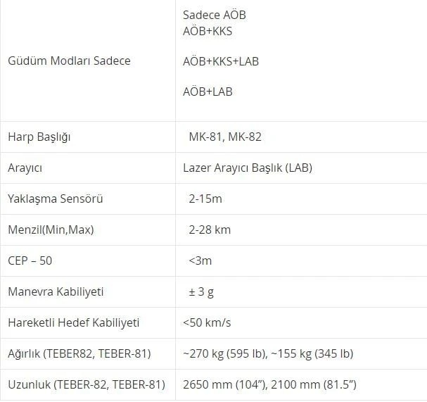 TEBER, Genel Maksat Bombaları’nı AÖB, KKS ve Yarı Aktif LAB kullanarak akıllı bir silah sistemi haline getirir. TEBER’in kuyruk bölümü, hassas güdüm sağlayacak AÖB ve KKS’den oluşmakta olup, sahada kullanıcı tarafından çok hızlı bir şekilde bombaya entegre edilebiliyor. Bomba gövdesi üzerinde bulunan gömlekler, stabilite ve kaldırma kuvveti sağlamasının yanı sıra, terminal güdüm fazında da yüksek manevra kabiliyeti sağlıyor.