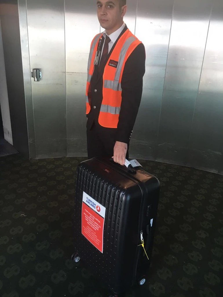 Etiket üzerinde yolcunun bilgileri yazılıyor. Daha sonra cihazlar THY'nin özel bavulunu yerleştiriliyor. Bu bavul, yer hizmetleri görevlisi tarafından uçak altındaki kargo bölümüne konuluyor.