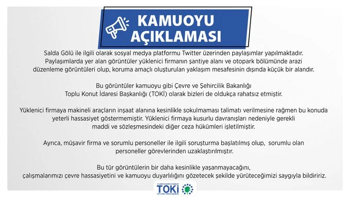TOKİ'nin sosyal medya hesabından yapılan açıklamada, Salda Gölü'ne ilişkin sosyal medya platformu Twitter'dan paylaşımlar yapıldığı belirtilen açıklamada, şunlar kaydedildi: