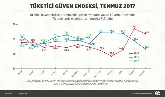 TÜİK ve Türkiye Cumhuriyet Merkez Bankası iş birliğiyle yürütülen anket sonuçlarından hesaplanan tüketici güven endeksi, temmuzda geçen aya göre yüzde 1,9 artış kaydetti. Buna göre haziranda 70 olan endeks değeri temmuzda 71,3 olarak kayıtlara yansıdı.