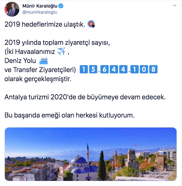 Vali Münir Karaloğlu, sosyal medya hesabından yaptığı açıklamada, Antalya turizminin 2019'da önemli ölçüde büyüme kaydettiğini belirtti.