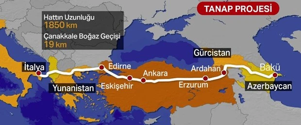 Dev proje ile Azerbaycan'ın Hazar Denizi'ndeki Şah Deniz 2 Gaz Sahası ve Hazar Denizi'nin güneyindeki diğer sahalarda üretilen doğalgazın öncelikle Türkiye'ye aktarılması planlanıyor. Türkiye üzerinden Avrupa'ya taşınacak doğalgaz hattı 20 ilden geçecek. Türkiye-Gürcistan sınırında Ardahan Posof Türkgözü köyünden başlayacak TANAP; Ardahan, Kars, Erzurum, Erzincan, Bayburt, Gümüşhane, Giresun, Sivas, Yozgat, Kırşehir, Kırıkkale, Ankara, Eskişehir, Bilecik, Kütahya, Bursa, Balıkesir, Çanakkale, Tekirdağ ve Edirne olmak üzere 20 ilden geçecek. TANAP'ın son durağı ve Yunanistan sınırında bulunan Edirne'nin İpsala ilçesi olacak.