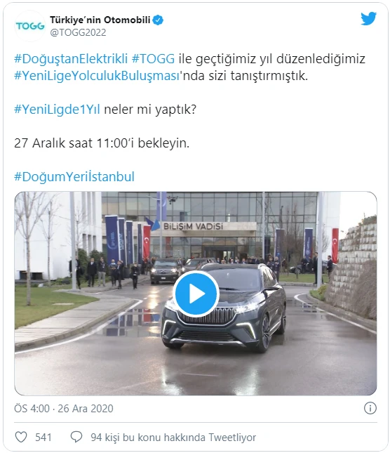 TOGG'un resmi Twitter hesabından yapılan yeni duyuruda "27 Aralık saat 11:00’i bekleyin" denildi.