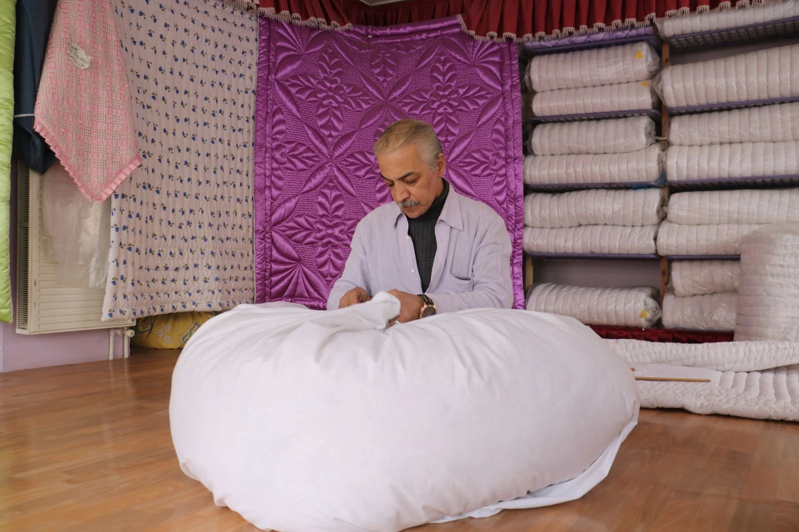 51 yaşında il dışından Sivas’a yorgancılık yapmaya gelen Kadir usta, koyun yününden yapılan yorganın elyafa göre daha sağlıklı olduğunu dile getirerek, “Bu işin birçok zorluğu var. El emeği ile çalışıyoruz. Her şey elde dönüyor. Tozu var birde. Meslektaşlarımızın birçoğu Koah hastası. Hepimizin olacağı şey. Elyaf suni bir şey insanı terletir. Teri emmez ve vücutta kireçlenmeye yol açan en büyük etkenlerdendir. Ama yün öyle değil. İçinde insan yattığı için sağlık bakımından hem teri emiyor, hem ısıtıyor. Sabah kalktığında yorgun kalkmıyorsun. İşler bayağı bir yoğun. Bir ara duraksama oldu. Elyafa yöneldi millet. Kireçleme başladıktan sonra tekrar yüne talep olmaya başladı. Şuan iyi’’ şeklinde konuştu.