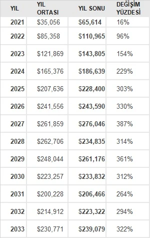 Analistlere göre 2021 sonu için Bitcoin fiyat tahminleri 50 bin doların üzerinde bir değeri gösteriyor. Uzun vadeli Bitcoin tahminlerine göre ise en büyük kripto para 2022 yılında 100 bin dolar olacak. 2024 yılı için ise tahminler 200 bin dolara işaret ediyor.