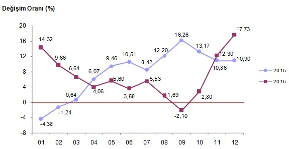 Ana sanayi grupları sınıflamasına göre 2016 yılı Aralık ayında en fazla aylık ve yıllık artış enerji mallarında gerçekleşti.