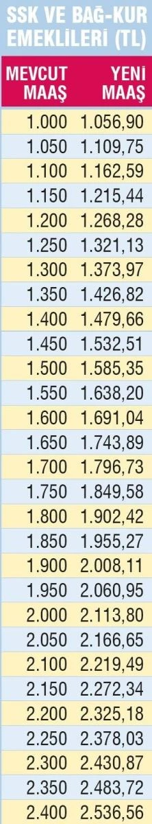 Tüm emeklilerin maaşlarına her ay ek ödeme (vergi iadesi) ilave ediliyor. SSK ve Bağ-Kur emeklileri, maaşın yüzde 4'ü oranında ek ödeme alıyor. Bu ay maaşlar arttığı için emeklilerin aldığı ek ödeme de yükseldi. Aralık ayında çıplak maaşı 2000 lira olan bir emekli 80 lira da ek ödeme alıyordu. Yeni zamla birlikte bu emeklinin çıplak maaşı 2.113,80 liraya ek ödemesi de 84,55 liraya yükseldi. Bu emeklimizin bankaya yatan 2.080 lira maaşı da 2.198,35 liraya çıktı..