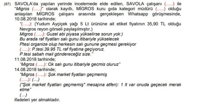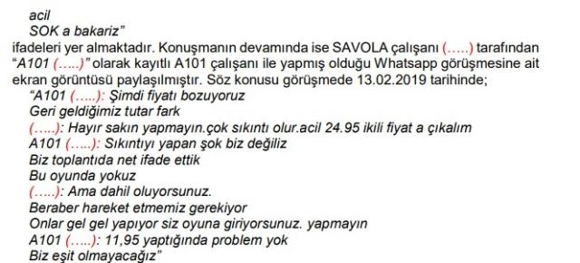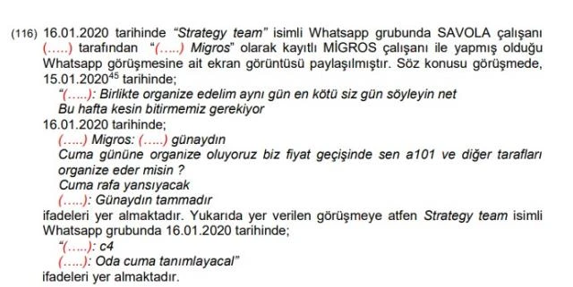Yazışmaların araştırılması kapsamında, “Strategy team” isimli Whatsapp grubunda bir SAVOLA çalışanı tarafından bir Migros çalışanı ile yaptığı görüşme ele alındı. Konuşma şu şekilde: