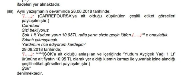 Soruşturma sürecinde yapılan inceleme ve tespitler sonucunda doğrudan veya ortak tedarikçiler aracılığıyla dolaylı temaslar yoluyla 5 zincir market arasında fiyat artışlarının ve satış fiyatlarının koordinasyonunun sağlandığı, piyasanın organize edilerek artırılan fiyatların rakiplerle eş zamanlı raflara yansıtıldığı, ürünün satış fiyatlarının tespiti amacına sahip topla-dağıt karteli niteliğindeki anlaşmalar veya uyumlu eylemler yoluyla söz konusu marketlerin 4. maddeyi ihlal ettikleri iddiaları üzerine sözlü savunmaları alınmıştı.