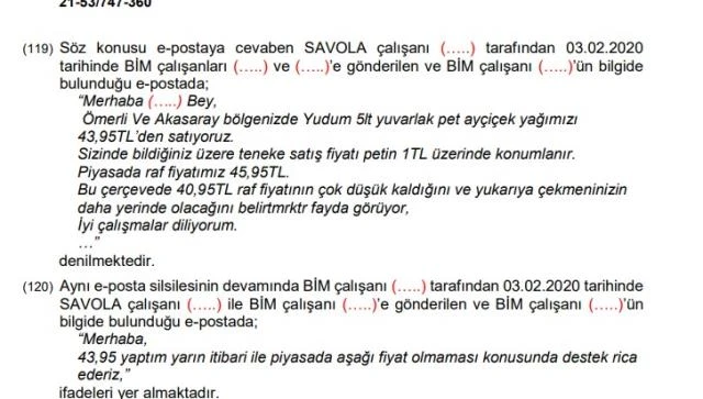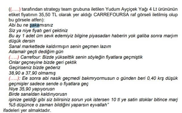 Aynı çalışan: BİM satın alma direktörü ile konuştuk az önce. CarrefourSA 5 litre fiyatını 45,95 gönderdi. Gol attınız bize dedi. Ben de ona 4 litre gönderdim. Son konuştuk piyasadan. CarrefourSA 47,95 lira yapacak merak etme dedim. Savola çalışanına ve CarrefourSA Satın Alma Uzmanı’na fiyat geçirmemiz şart oldu.