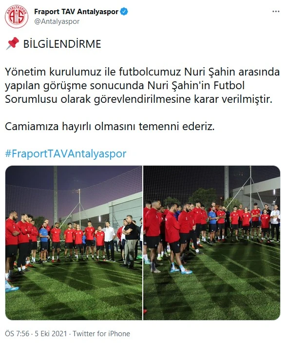 Antalyaspor'dan yapılan açıklamada, "Yönetim kurulumuz ile futbolcumuz Nuri Şahin arasında yapılan görüşme sonucunda Nuri Şahin'in Futbol Sorumlusu olarak görevlendirilmesine karar verilmiştir. Camiamıza hayırlı olmasını temenni ederiz." ifadeleri kullanıldı.