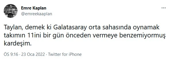 Emre Kaplan yaptığı paylaşımda, "Taylan, demek ki Galatasaray orta sahasında oynamak takımın ilk 11'ini bir gün önceden vermeye benzemiyormuş kardeşim" ifadelerini kullandı. Taylan Antalyalı'nın bu iddiaya vereceği yanıt merak konusu oldu.