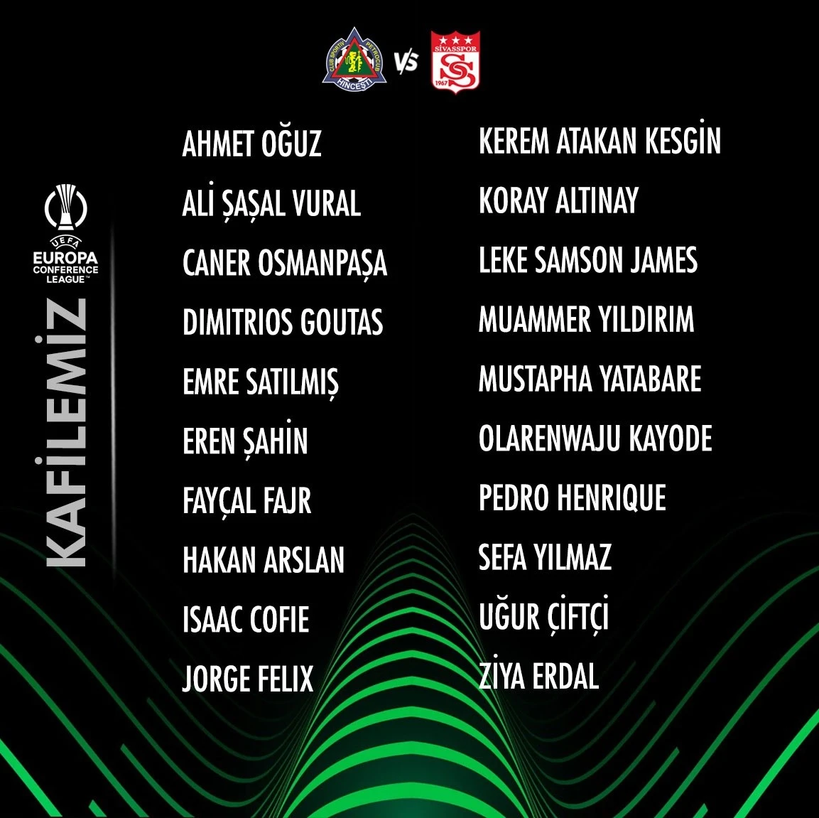 UEFA Avrupa Konferans Ligi 2. ön eleme turunda Moldova temsilcisi Petrocub ile karşılaşacak olan DG Sivasspor’da maçın kamp kadrosu açıklandı.Sivasspor’un yarın Petrocub ile oynayacağı maç kadrosu belli oldu. Rıza Çalımbay, kafilede şu isimlere yer verdi: “Ahmet Oğuz, Ali Şaşal Vural, Caner Osmanpaşa, Dımıtrıos Goutas, Emre Satılmış, Eren Şahin, Fayçal Fajr, Hakan Arslan, Isaac Cofie, Jorge Felix, Kerem Atakan Kesgin, Koray Altınay, Leke Samson James, Muammer Yıldırım, Mustapha Yatabare, Olarenwaju Kayode, Pedro Henrique, Sefa Yılmaz, Uğur Çiftçi, Ziya Erdal.”