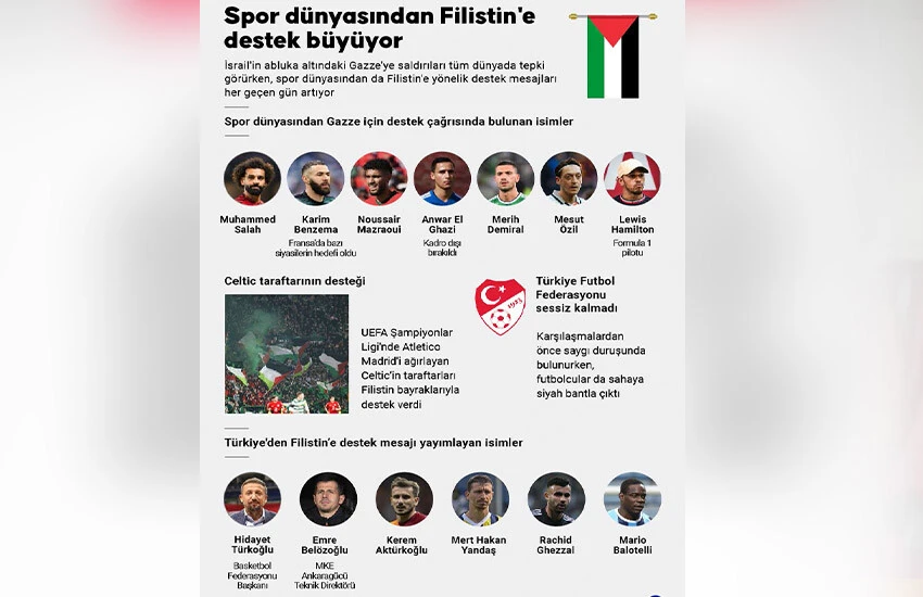 Türkiye'den Basketbol Federasyonu Başkanı Hidayet Türkoğlu, MKE Ankaragücü Teknik Direktörü Emre Belözoğlu, Galatasaraylı futbolcu Kerem Aktürkoğlu, Fenerbahçeli Mert Hakan Yandaş, Beşiktaş'ın Cezayirli futbolcusu Rachid Ghezzal, Adana Demirsporlu Mario Balotelli, Suudi Arabistan ekibi Al Ahli'de forma giyen milli futbolcu Merih Demiral, eski futbolcu Mesut Özil, saldırılar nedeniyle Filistin'e destek mesajı yayımladı.