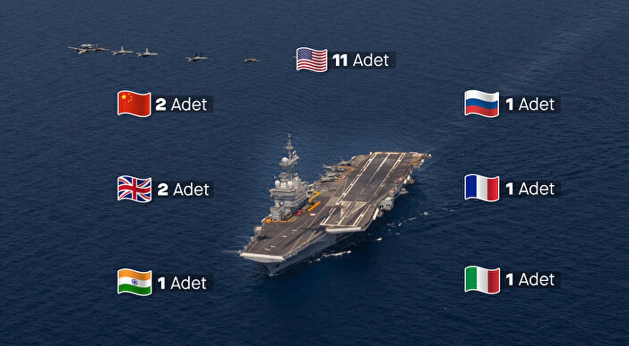 Dünyada 7 ülkede bulunan ve muazzam bir üstünlük sağlayan uçak gemilerden ABD’de 11 adet, Çin ve İngiltere’de 2, Hindistan, Rusya, İtalya ve Fransa’da ise 1’er adet bulunuyor. Türkiye’nin kendi uçak gemisini yapması ise yaklaşık 7 yıllık bir dönemi kapsayabileceğinin altı çiziliyor.