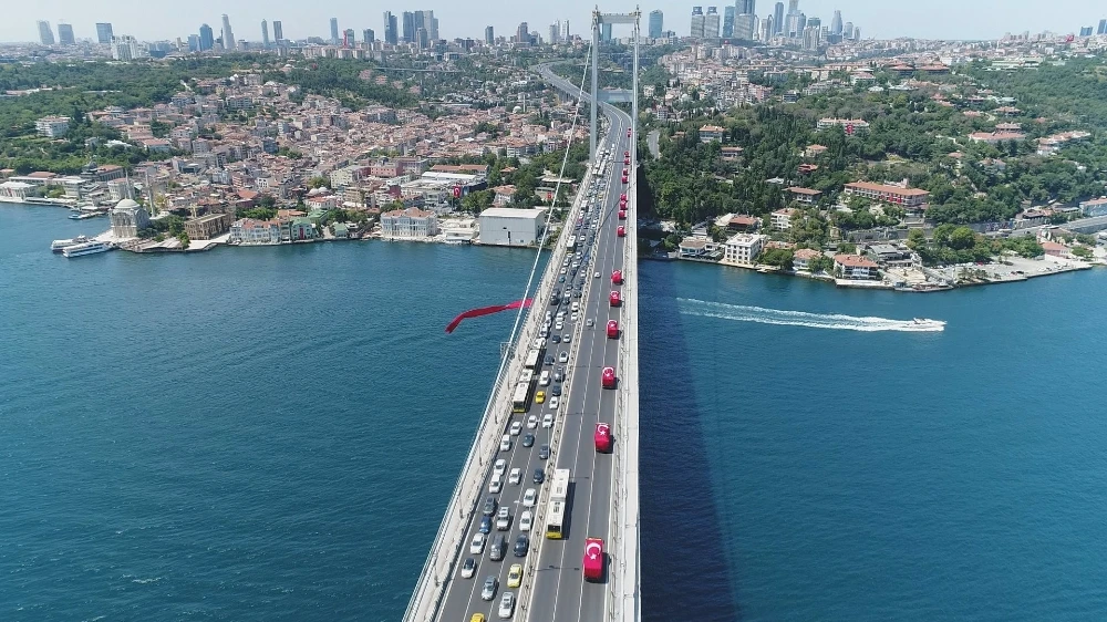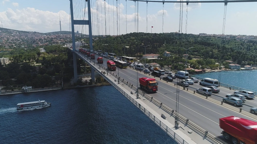 Kornalar çalarak köprüden geçen kamyonların üzerindeki Türk bayrakları dikkat çekti. Metrelerce uzunluğundaki kamyon konvoyunun köprüden geçiş anı havadan görüntülendi.