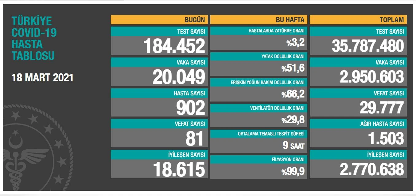 Sağlık Bakanlığının Covid-19 bilgilendirme sayfasında Türkiye’nin güncel korona virüs tablosu kamuoyuyla paylaşıldı. Tabloya göre son 24 saatte 81 kişi korona virüsten hayatını kaybetti, toplam can kaybı 29 bin 777’e yükseldi. Toplamda 35 milyon 787 bin 480 test yapıldı. Bugün yapılan 184 bin 452 testten, 20 bin 49 yeni vaka sayısı, 902 de yeni hasta sayısı olduğu belirtildi. Toplam vaka sayısının 2 milyon 950 bin 603 olduğu, bugün iyileşen 18 bin 615 kişiyle birlikte toplam iyileşen hasta sayısının 2 milyon 770 bin 638’a yükseldiği, toplam hastalarda zatürre oranının yüzde 3,2, ağır hasta sayısının ise bin 503 o.