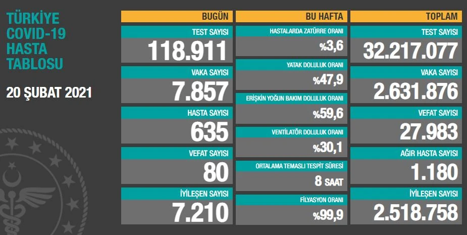 Türkiye'de son 24 saatte 118 bin 911 Kovid-19 testi yapıldı, 7 bin 857 kişinin testi pozitif çıktı, 80 kişi hayatını kaybetti.