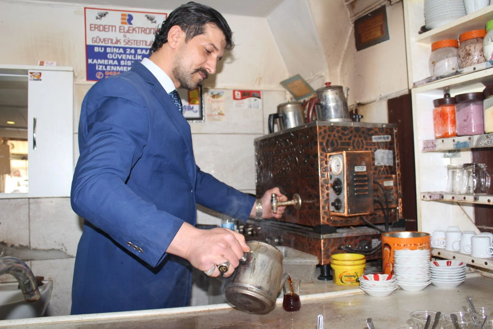 Sabah saat 4'de çay ocağını açtığını aktaran Gündoğdu,takım elbisesiyle ilk çayı koyup, tabakları çamaşır suyundan çıkartıktan sonra iskemleleri yerleştirip çay servisine başladığını aktardı.