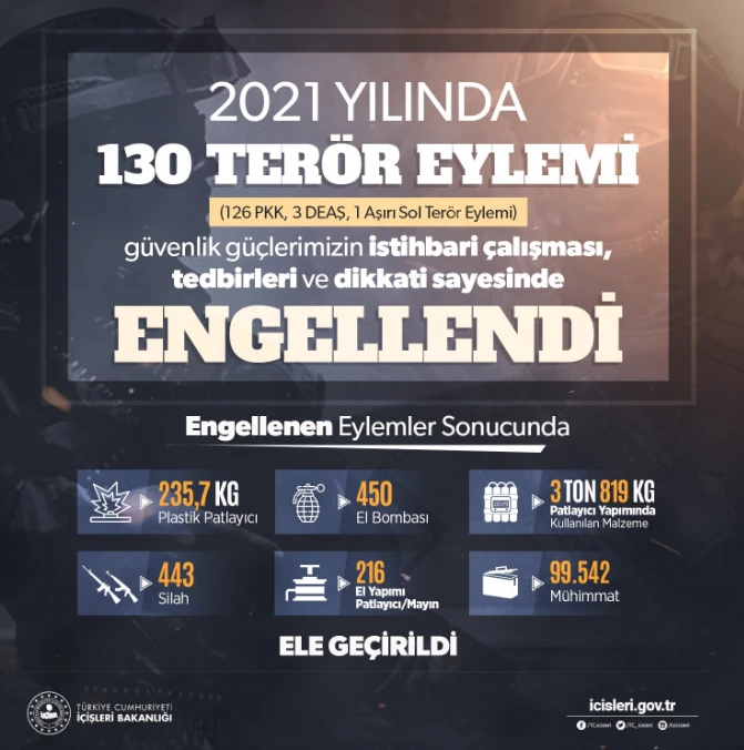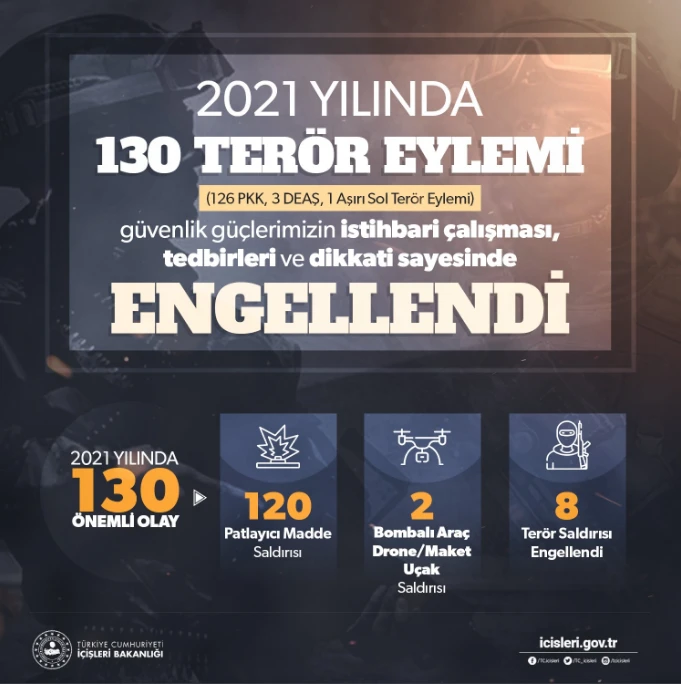 İçişleri Bakanlığı resmi Twitter hesabında yapılan açıklamada, bu yıl içinde terör örgütüne yönelik çalışmalara yer verildi. Bilançonun açıklandığı paylaşımda, "2021 yılında güvenlik güçlerimizin istihbari çalışması, tedbirleri ve dikkati sayesinde 130 terör eyleminin engellendi" ifadeleriyle birlikte bu eylemlerinin detaylarının ayrıntılı olarak anlatıldığı iki grafiğe yer verildi.