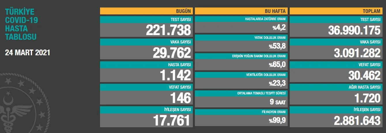 Test sayısı 36 milyon 990 bin 175'e ulaştı. Vaka sayısı 3 milyon 91 bin 282, vefat sayısı 30 bin 462, ağır hasta sayısı 1720 oldu.