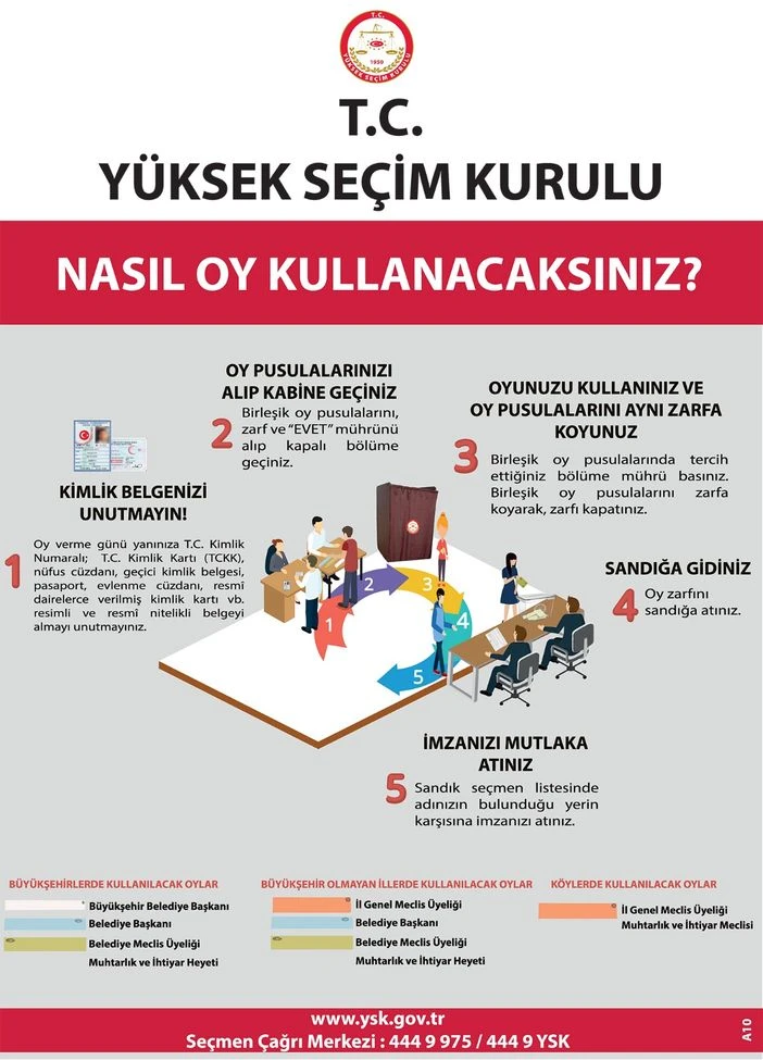 YSK’nın sitesinde nasıy oy kullanılacağına dair bir broşür de yayımlandı. Buna göre, 5 adımda oy verme işlemi şu şekilde olacak;