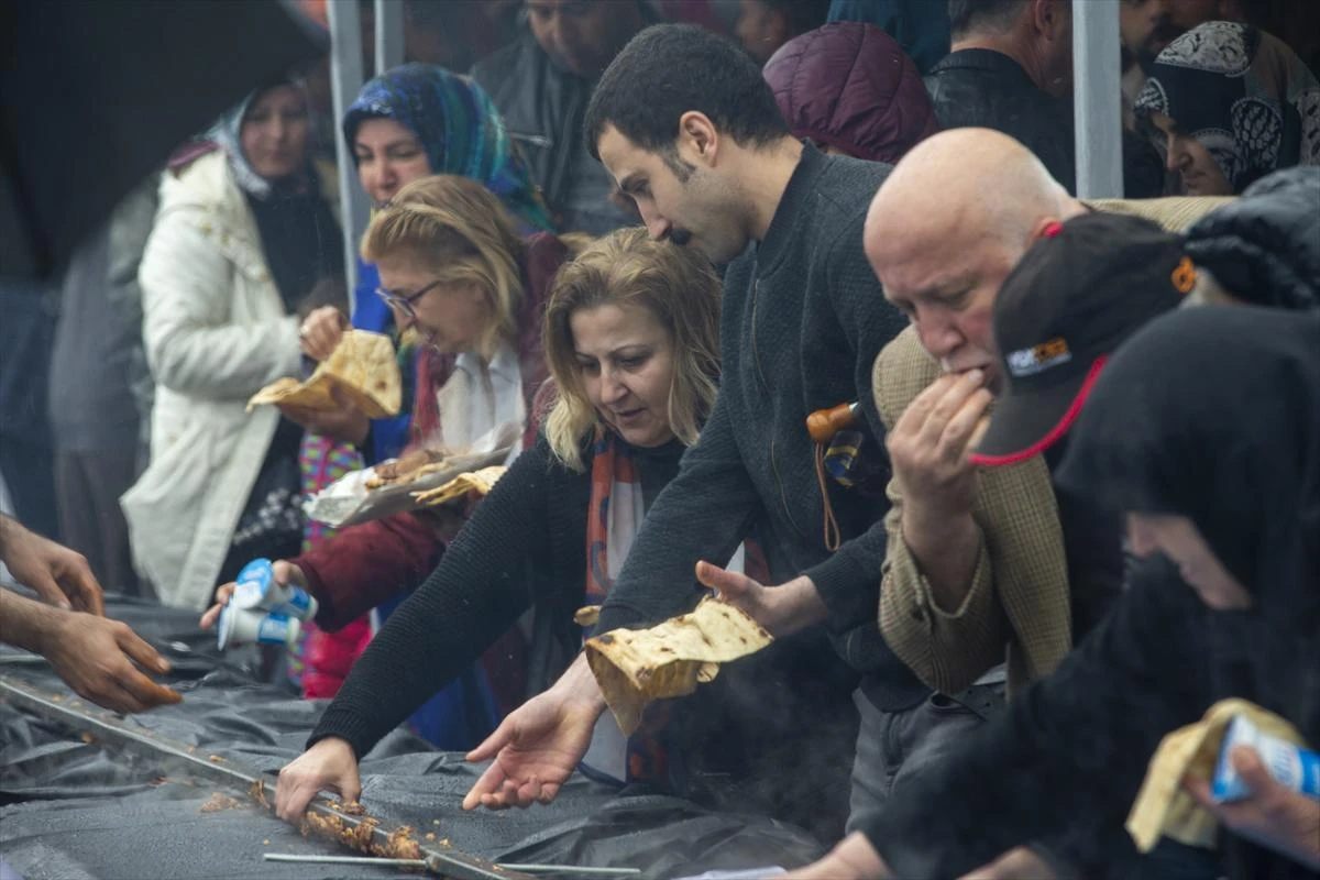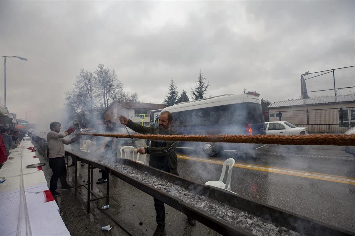 Kebap ustaları, özel hazırlanan mangalda 40 metrelik kebap pişirdi. Yağmur altında gerçekleştirilen ve yapımı 30 kişilik ekiple 2 saati bulan 40 metrelik kebap, pişirilmesinin ardından saniyeler içinde yendi.