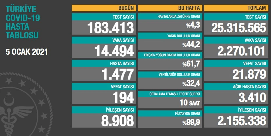 Türkiye'de son 24 saatte 183 bin 413 Kovid-19 testi yapıldı, 14 bin 494 kişinin testi pozitif çıktı, 194 kişi hayatını kaybetti. Ağır hasta sayısı 3 bin 410 oldu, 8 bin 908 kişinin Kovid-19 tedavisi/karantinasının sona ermesiyle iyileşen sayısı 2 milyon 155 bin 338'e yükseldi.