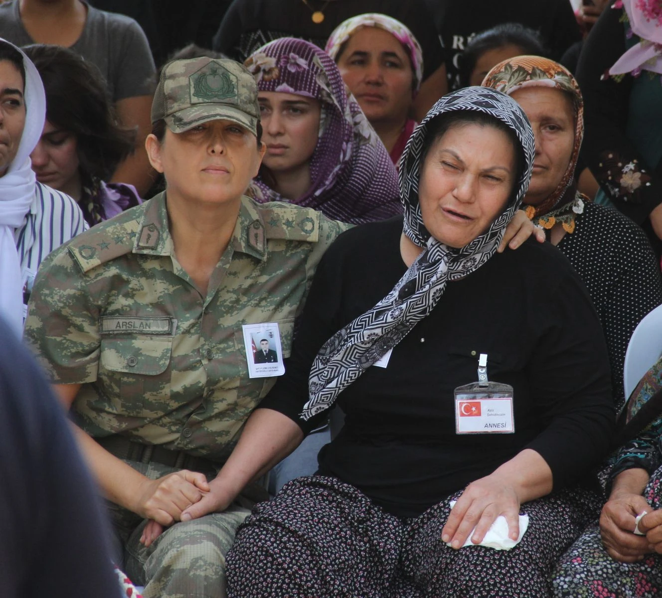 Şehidin annesini kadın komutan teskin etti. Şehidin babası Mustafa Hatipoğlu da tören alanında ayakta duramayınca bir sandalyeye oturtuldu.