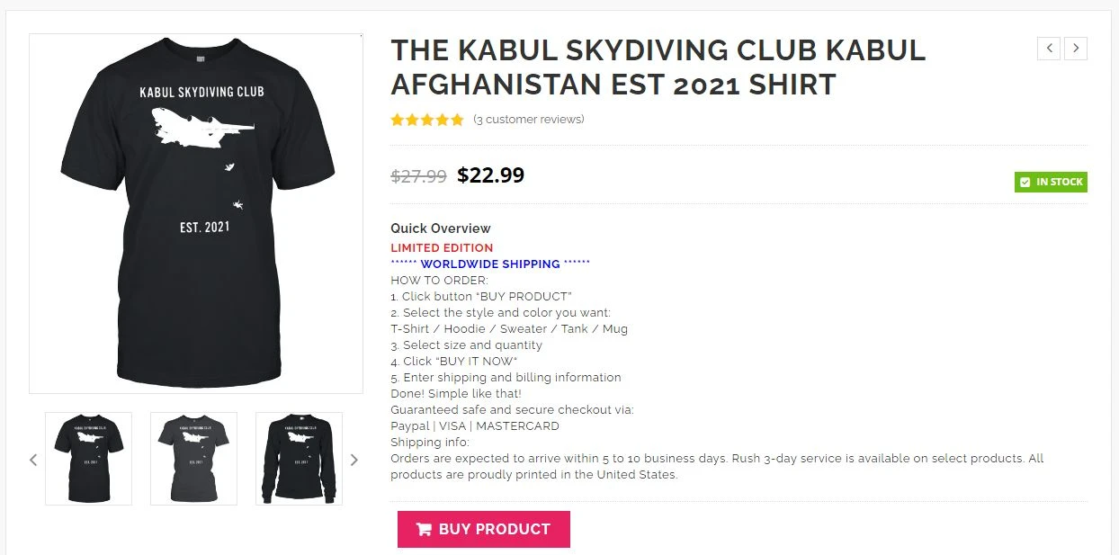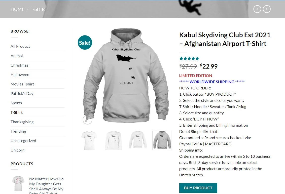 Tee4Sport ve TShirtAtLowPrice.com dahil olmak üzere birçok markanın, çevrimiçi giyim mağazalarında kullanıcılarının beğenisine sunduğu tişörtlere sosyal medyada tepki yağdı. Tişörtün üzerinde uçaktan düşen Afganların siluetin resmedilirken, üzerine de 'Kabul Skydiving Club Est. 2021' ve 'Kabil Atlama Kulübü, 2021'de Kuruldu" yazısı yazıldı. Tişörtlerin satıldığı online alışveriş platformlarında 'Bu satışı durdurun' çağrıları yapıldı. Ancak ürünler hala sanal mağazalarda satılıyo.