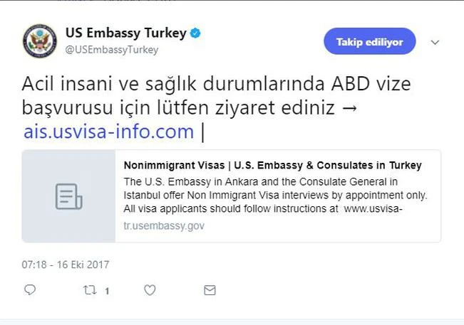 Amerika Birleşik Devletleri Büyükelçiliği sosyal medya hesabından sağlık ve insani durumlarda verilecek olan ABD vizesi için bir duyuru yaptı. ABD Büyükelçiliği'nin Türkiye'ye vizeleri askıya aldıklarını duyurmasının ardından süren kriz devam ederken yeni bir hamle geldi. ABD, Twitter hesabı üzerinden sağlık ve insani durumlarda verilecek olan ABD vizesi için duyuru yaptı. Bu tür başvurular için vize hizmeti açıldı. Elçilikten yapılan açıklamada, "Acil insani ve sağlık durumlarında ABD vize başvurusu için lütfen ziyaret ediniz → https://ais.usvisa-info.com/" denilerek vize hizmetinin yapıldığı siteye yönlendirme yapıldı.