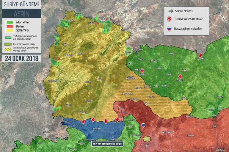 Abdullah Ağar, yazısında Zeytin Dalı harekatına ilişkin bir harita da paylaştı.