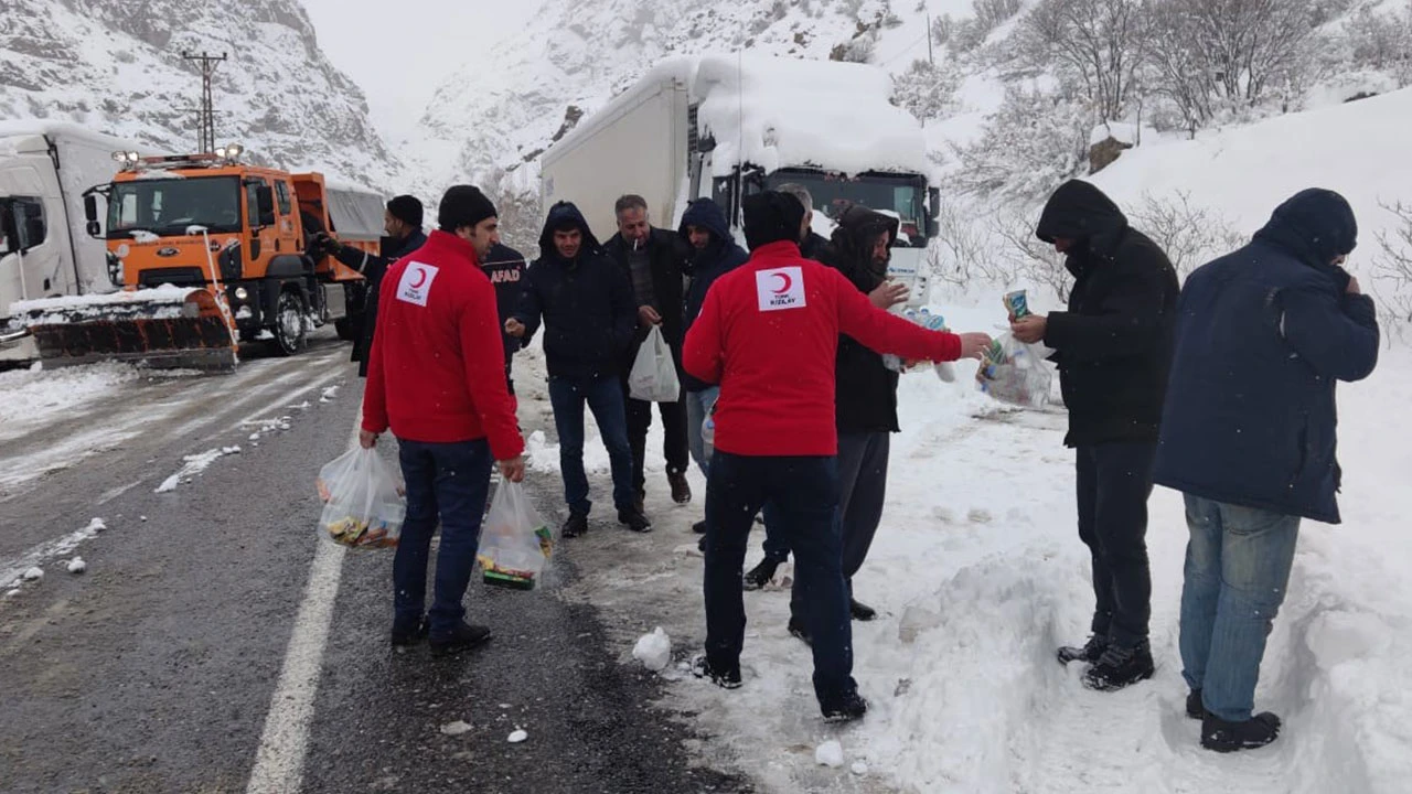 Kızılay Hakkari Şubesi ve AFAD İl Müdürlüğü ekipleri, iki gündür devam eden kar yağışı nedeniyle yollarda kalan sürücülere kumanya dağıttı.