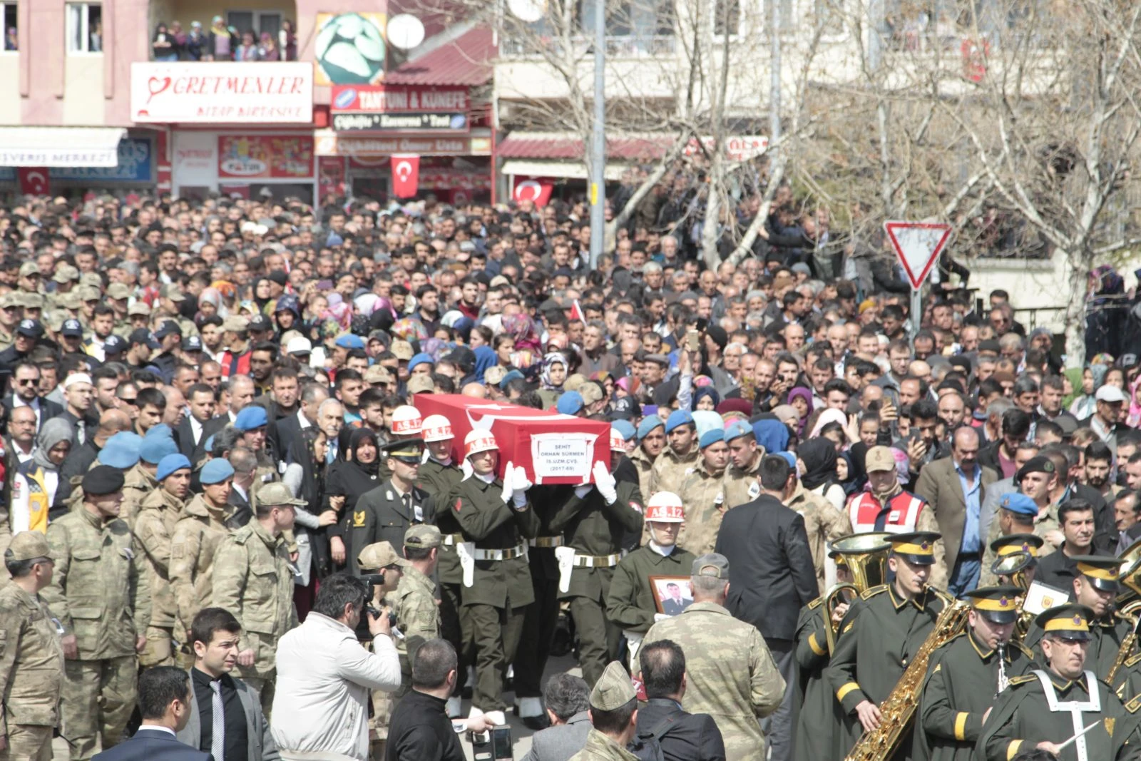 Şehidin silah arkadaşlarının da geldiği törene katılan binlerce kişi, dualar eşliğinde tekbir getirip, "Şehitler ölmez, vatan bölünmez" sloganı attı.