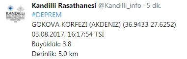 Boğaziçi Üniversitesi Kandilli Rasathanesiverilerine göre, Akdeniz'de saat 16:17 sıralarında Richter Ölçeği'ne göre 3.8 büyüklüğünde deprem meydana geldi.